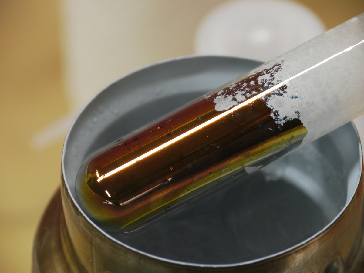 Here's an interesting reaction where lithium metal is dissolved in anhydrous ammonia. I placed a couple small pieces of lithium in a test tube, then connected the tube to a larger flask of ammonium hydroxide via silicone tubing. Upon heating the flask, gaseous ammonia will be produced which is condensed in the test tube by cooling it with a bath of alcohol and dry ice. The resulting solution is brilliant bronze in color, but at lower lithium concentrations, the solution is deep blue -- a very beautiful reaction.